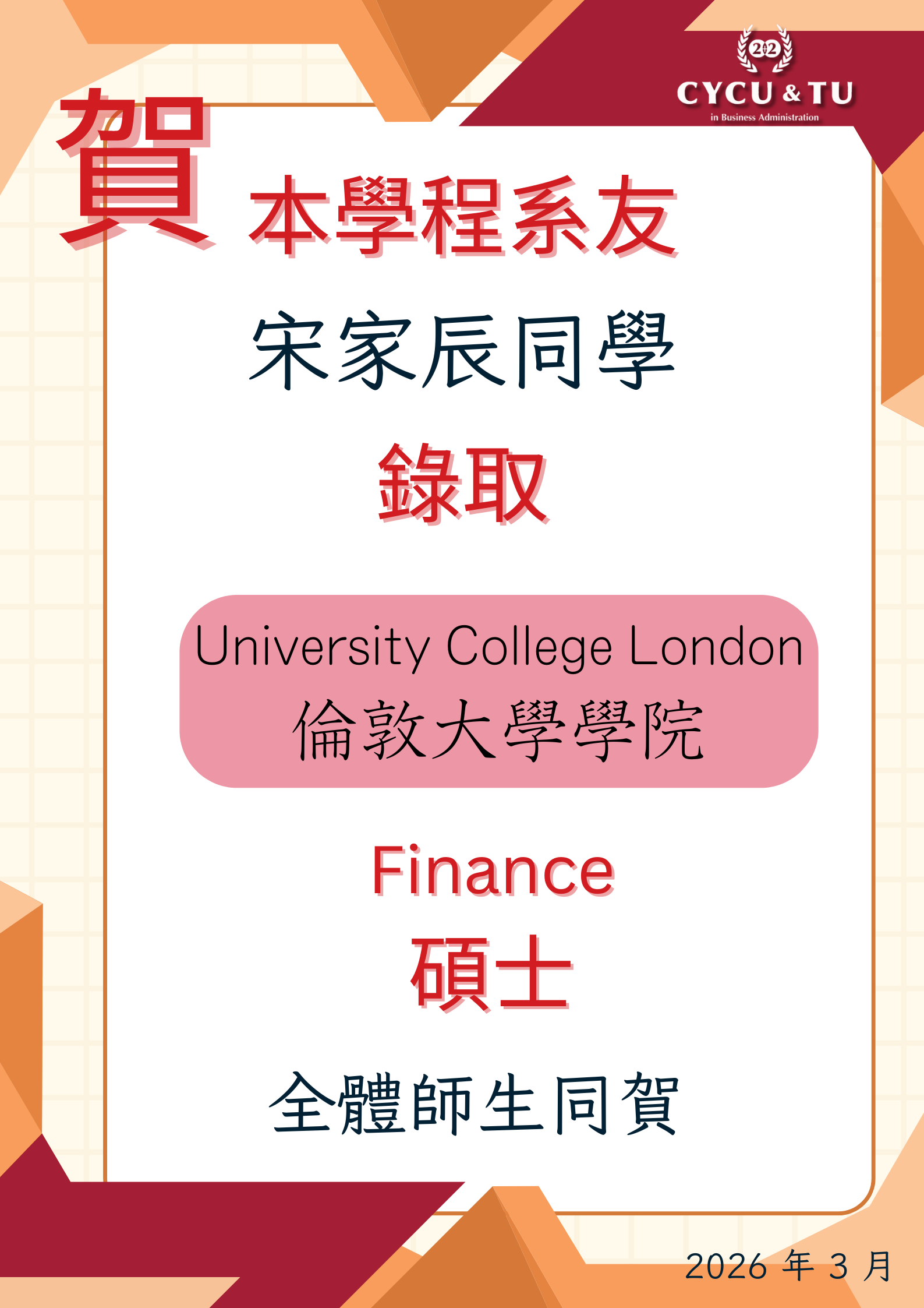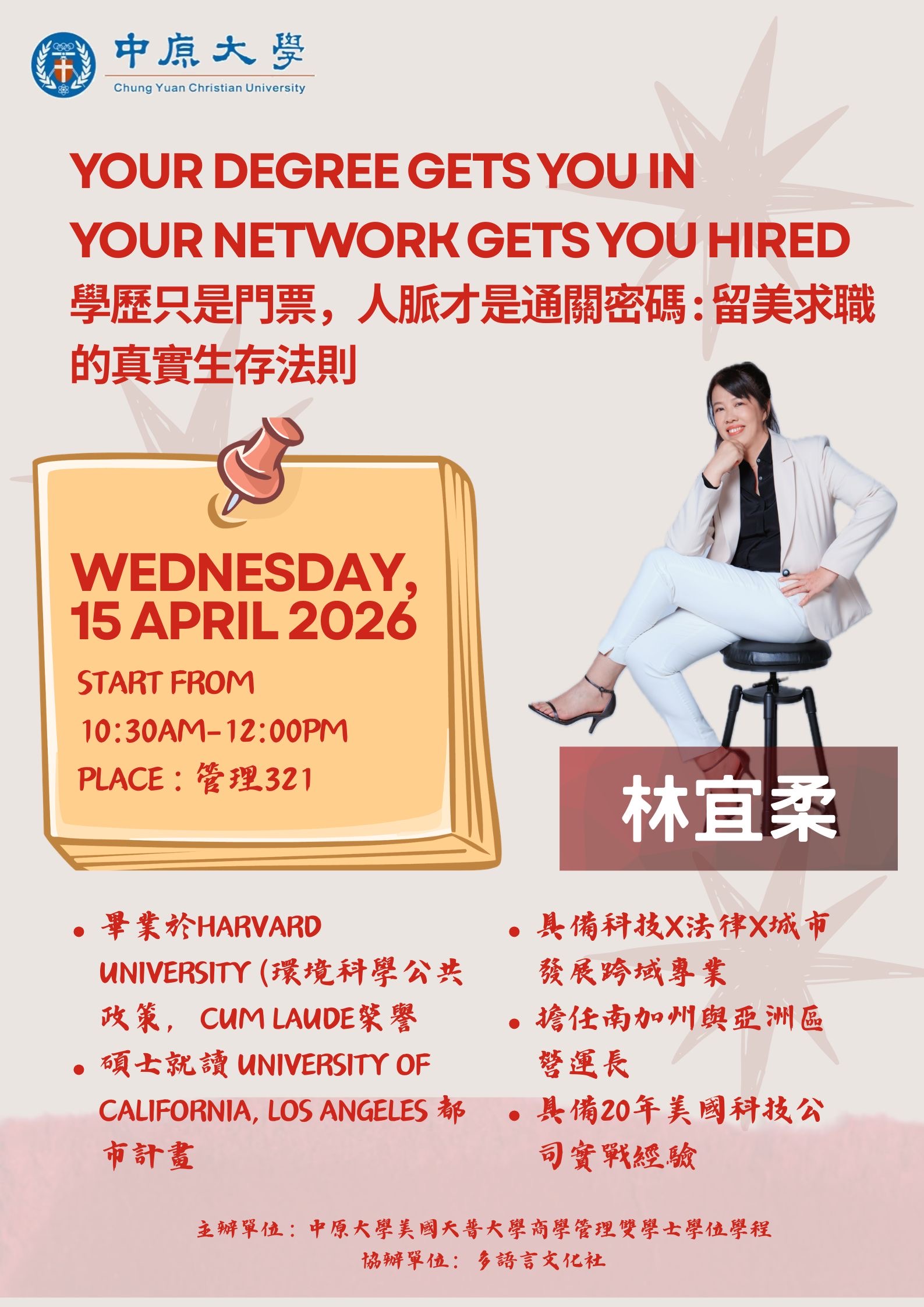- 扎實基礎,無縫銜接:前兩年於中原學習專業知識、強化英語能力;後兩年前往美國天普大學,體驗國際化的學習環境與全英語授課。