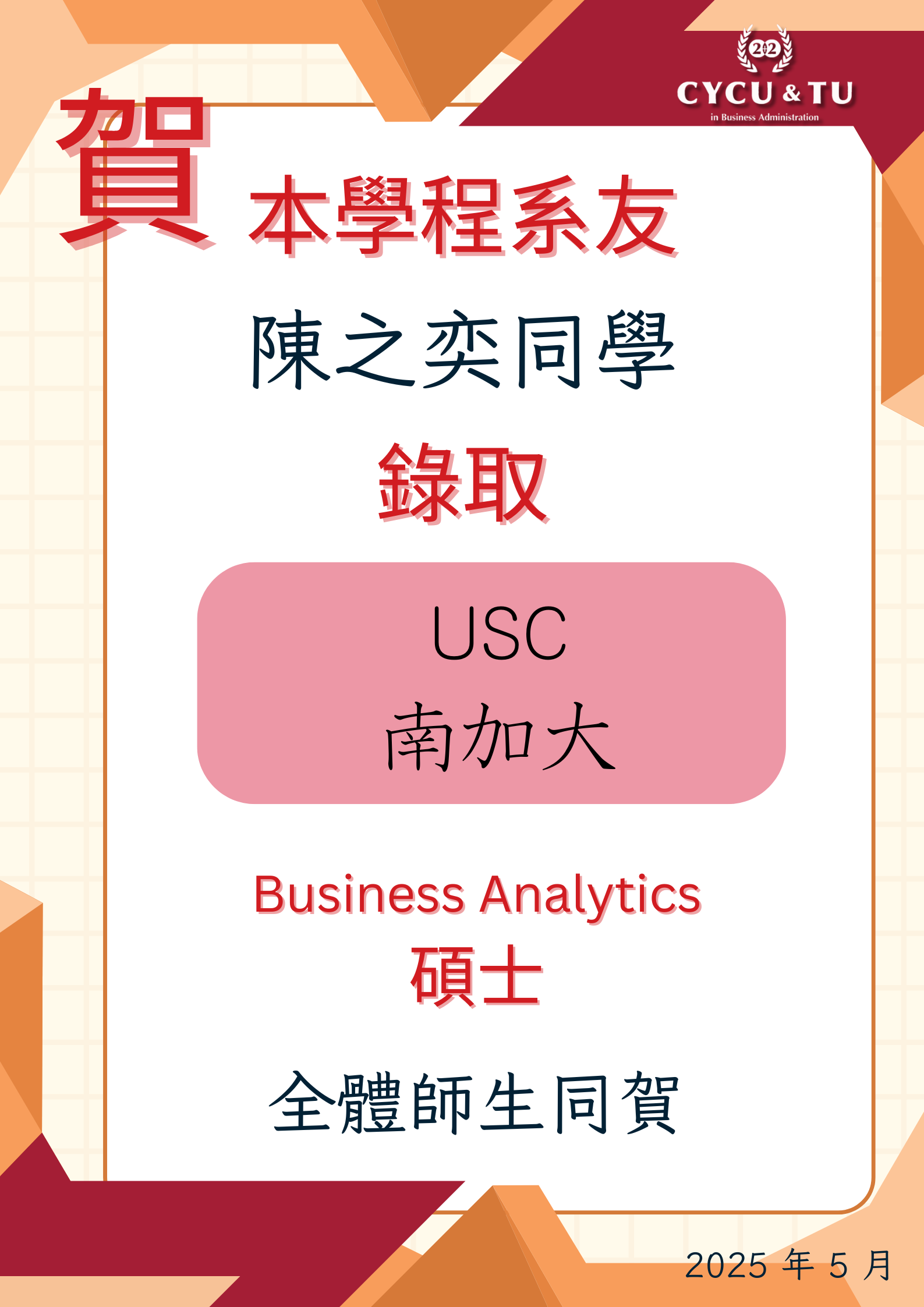 恭賀! 學程系友陳之奕錄取南加州大學Business Analytics碩士