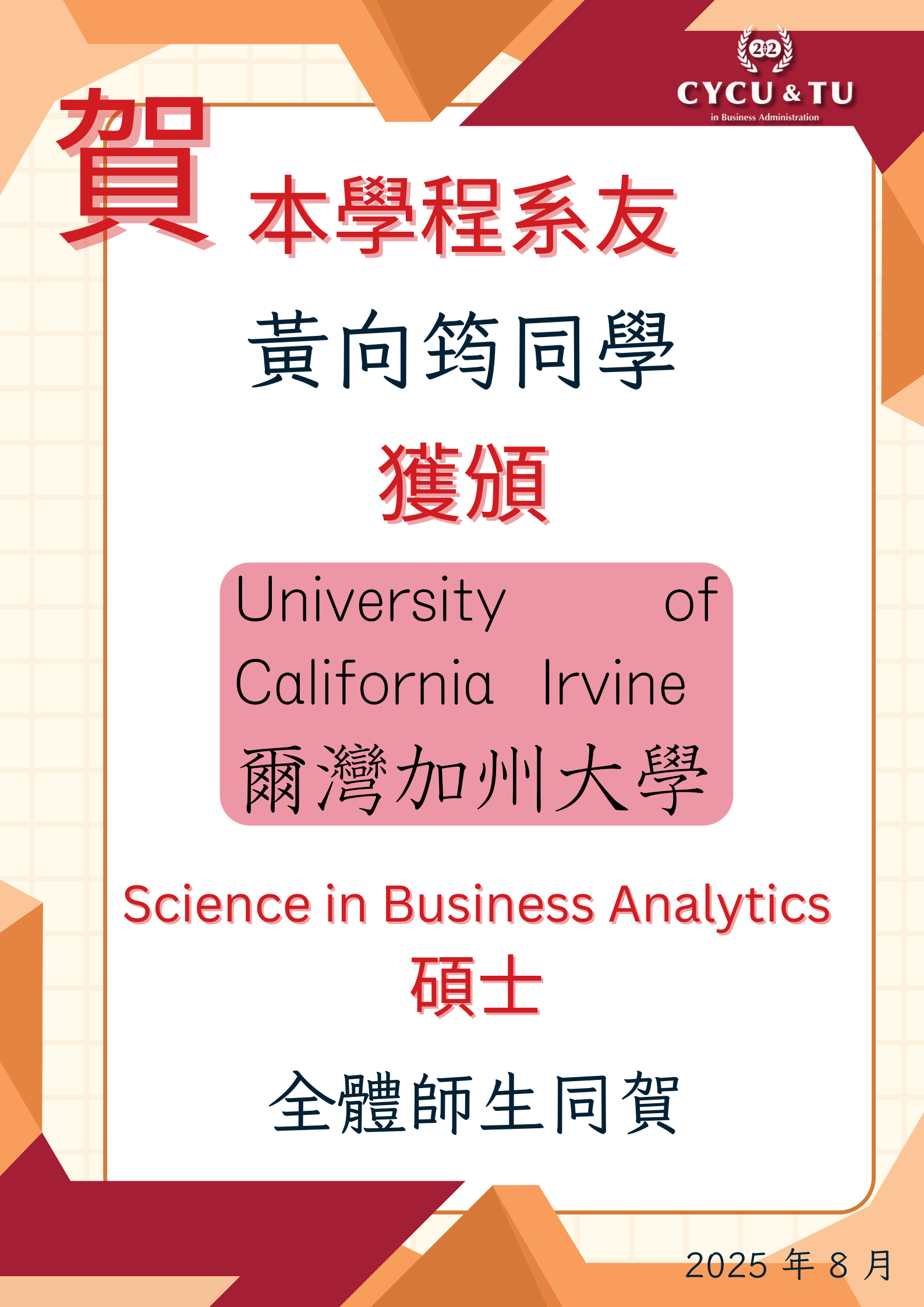 Congratulations! Program alumna Hsiang-Yun Huang has been awarded a Master’s degree in Business Analytics from the University of California, Irvine. 2025-06-19 Honor / News