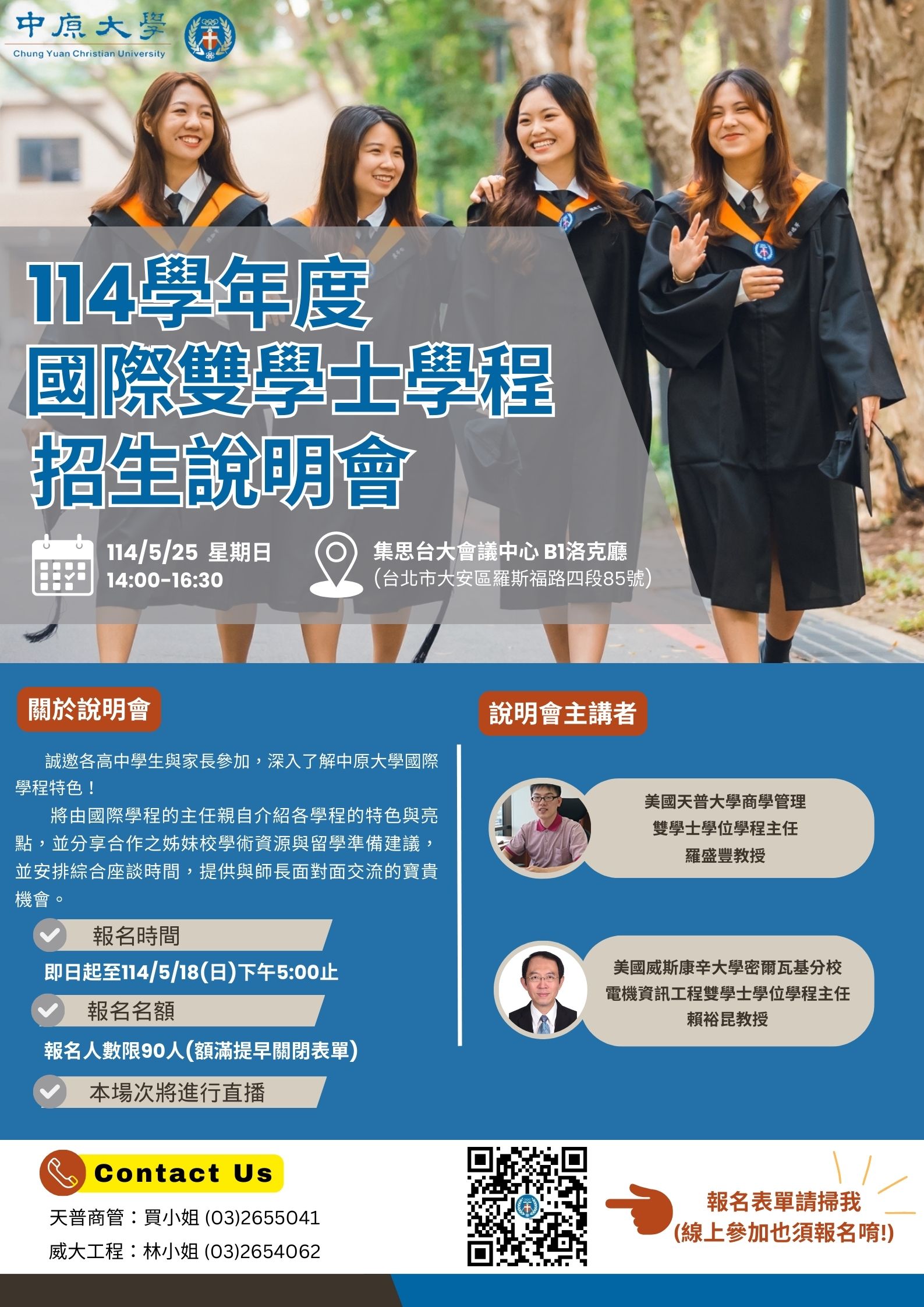 Chung Yuan Christian University’s International Dual Bachelor’s Degree Program will hold an additional session of the “2025 Admissions Information Session,” aiming to provide students and parents with a more comprehensive and in-depth understanding of our international programs. After the introduction of each program, a joint panel discussion will be held, giving you the opportunity to interact directly with program directors. We sincerely invite you to register and join us.