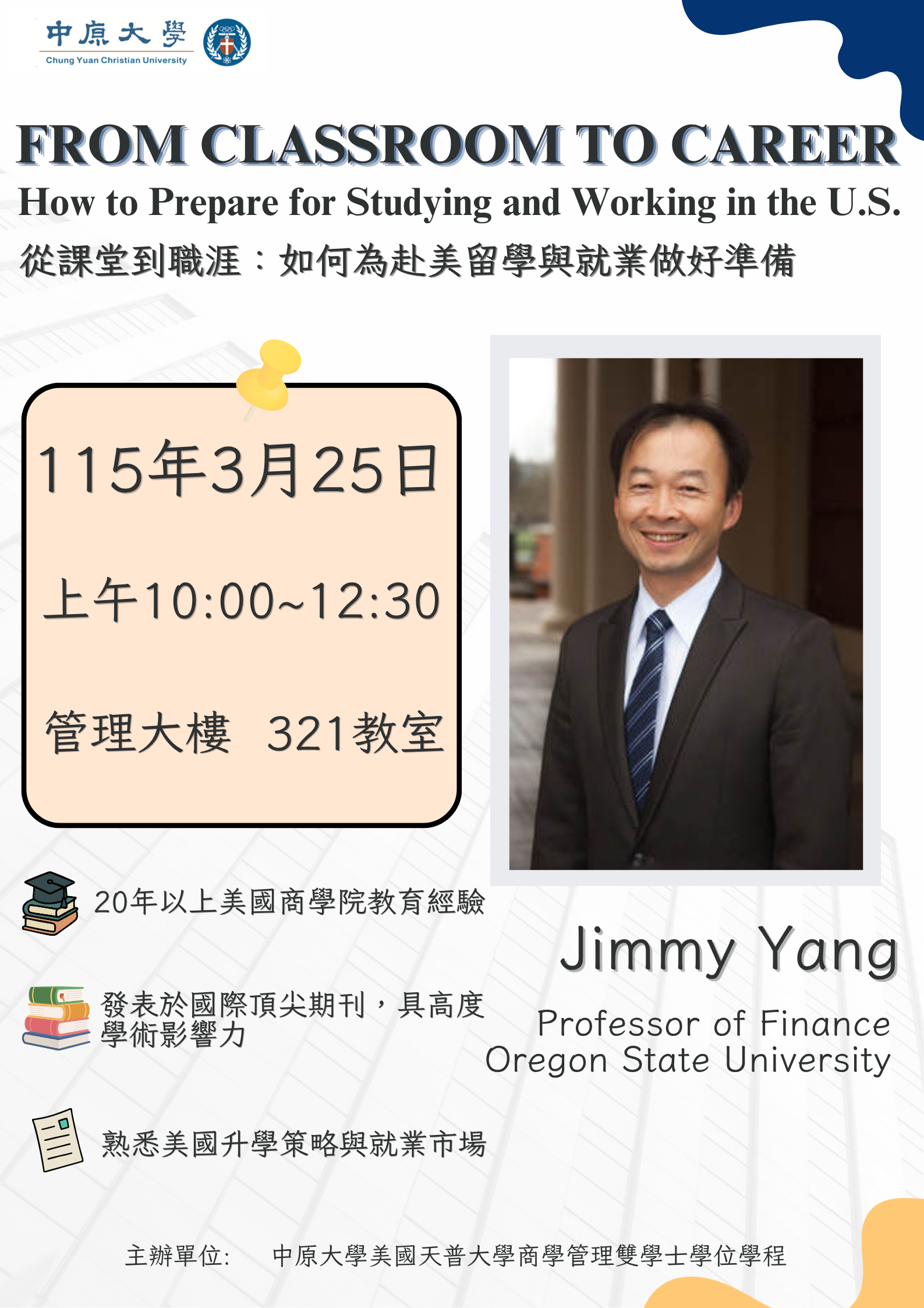 To help Temple Program students plan for future study and career opportunities in the United States, we are pleased to invite Mr. Jimmy Yang to share insights on preparing for studying and working in the U.S. The session will cover study planning, career development, job preparation, and personal experience sharing.