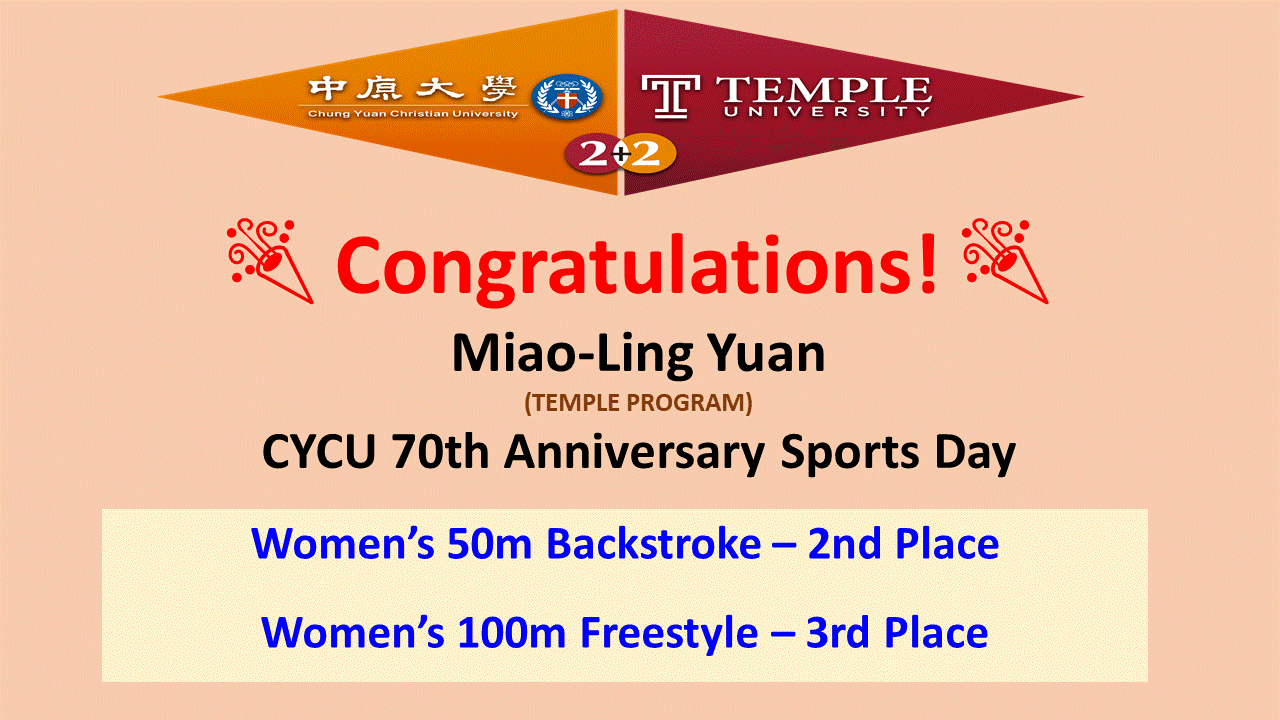 We are proud to announce that Miao-Ling Yuan from our program achieved outstanding results at the CYCU 70th Anniversary Sports Day: Women’s 50m Backstroke –